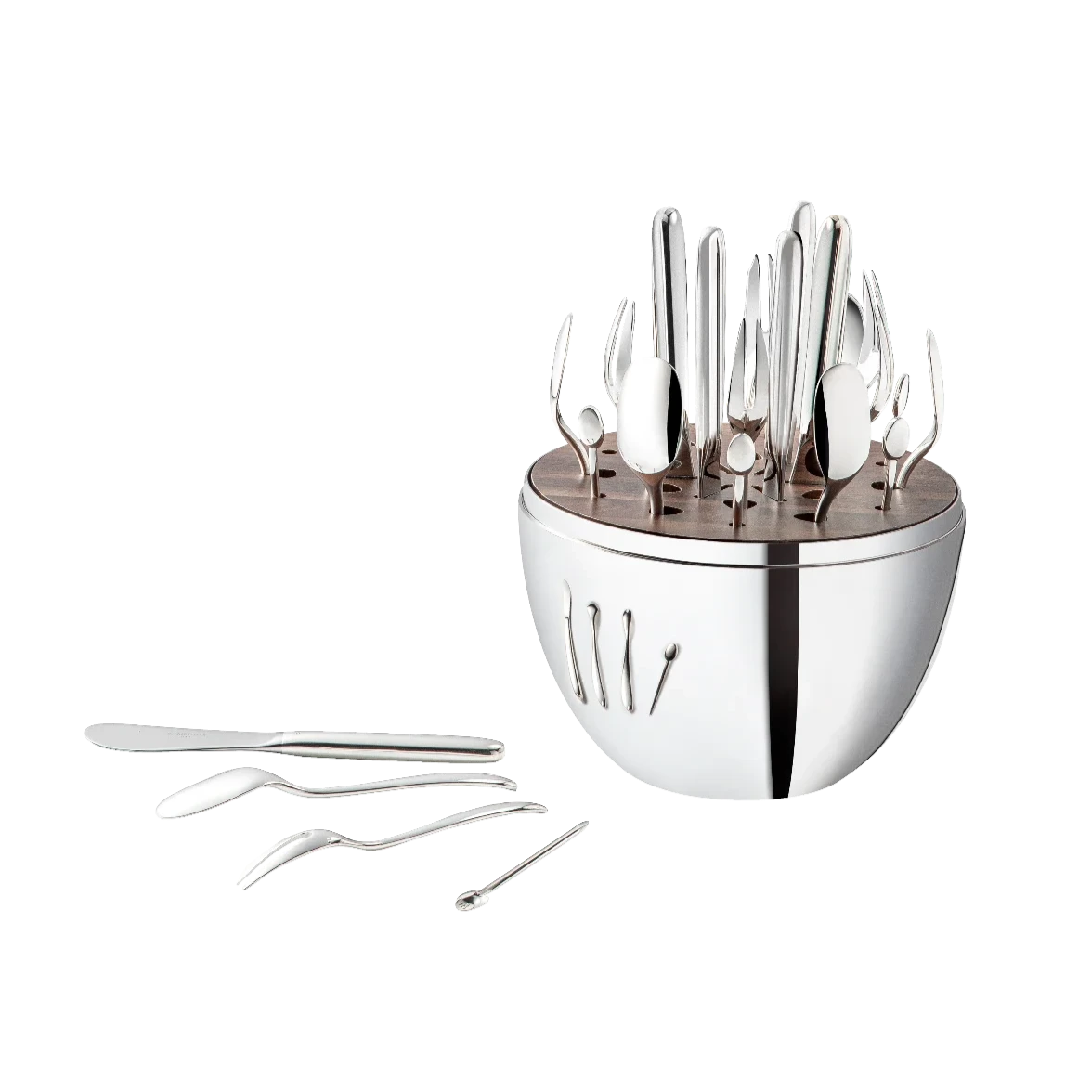 A cutlery set for 6 designed for informal dining moments, featuring pieces for sweet & savory snacks and cocktails. Stored in a modern egg-shaped capsule.