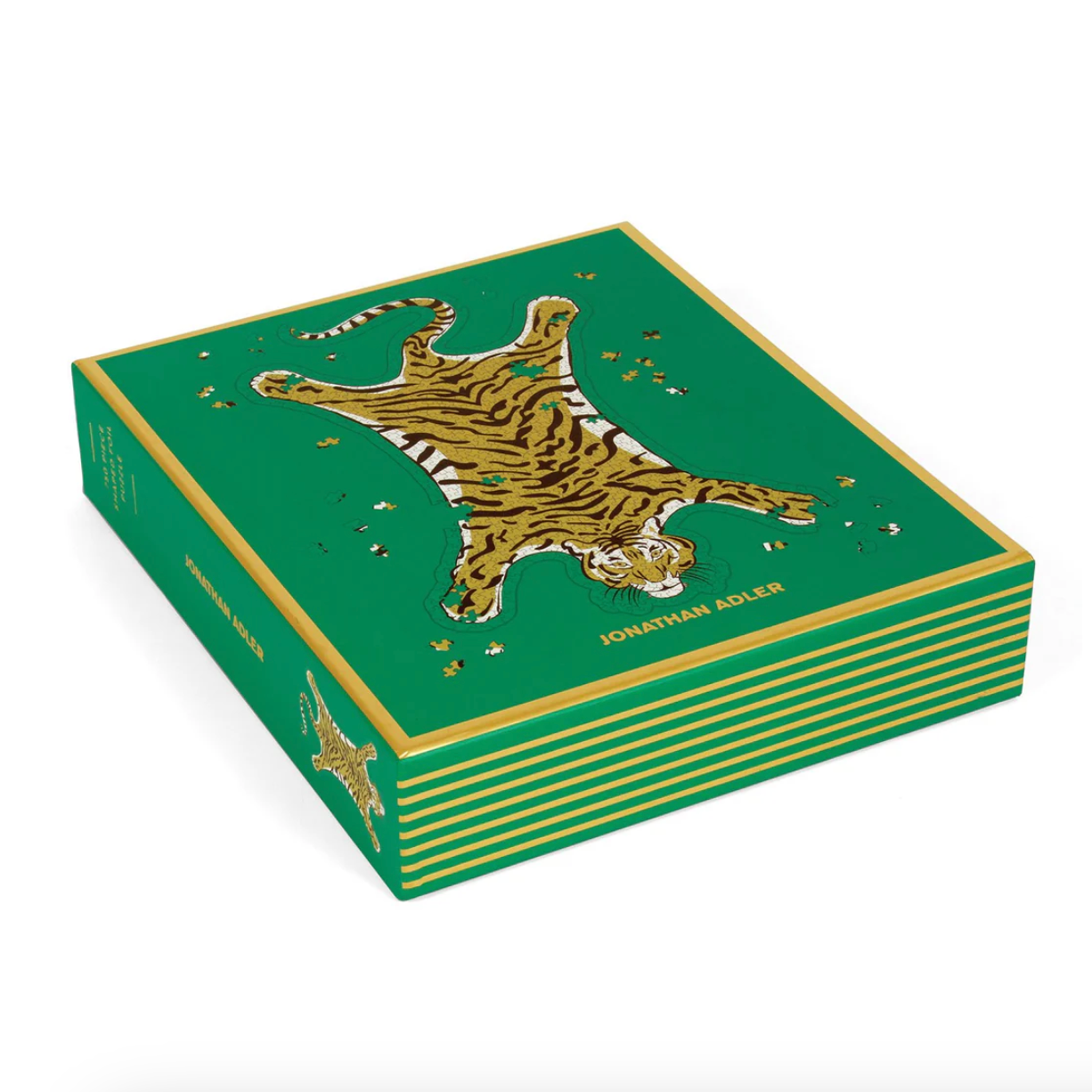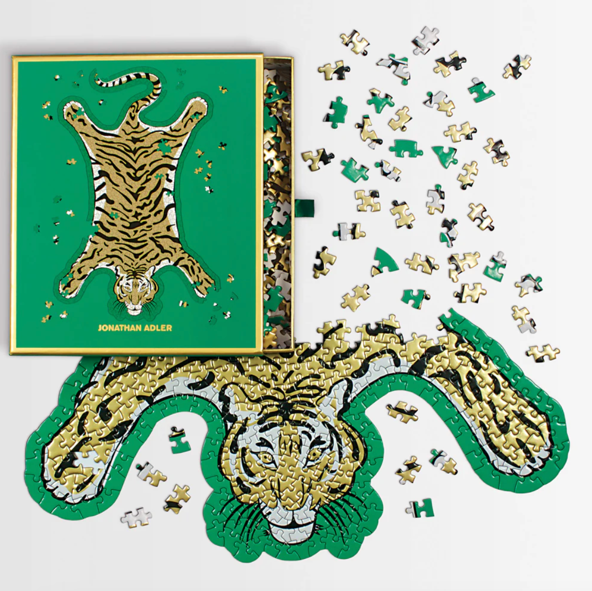 Features Jonathan Adler's iconic tiger image with luxurious gold foil accents in a shaped puzzle.